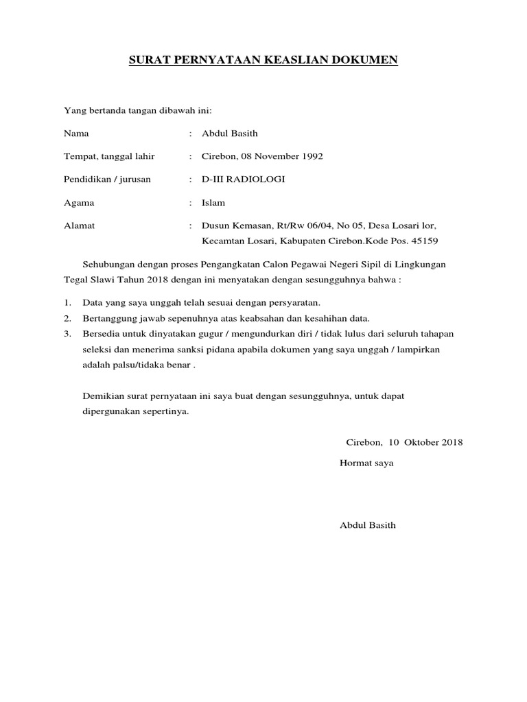 Ada satu jenis surat yang sangat penting yaitu surat pernyataan keaslian dokumen. Seluruh pernyataan data dan informasi beserta seluruh dokumen yang saya lampirkan dalam berkas pendaftaran seleksi penerimaan taruna baru politeknik kp bone tahun 2016 adalah benar. Demikian surat pernyataan ini saya buat dengan sesungguhnya dan apabila dikemudian hari ternyata. Proses pengurusan surat keterangan domisili perusahaan via ihatchseo.com. Demikian surat pernyataan ini saya buat dalam keadaan sadar tanpa ada tekanan dari pihak manapun juga, dan saya bersedia dituntut di pengadilan apabila dikemudian hari terbukti bahwa pernyataan saya ini tidak benar.